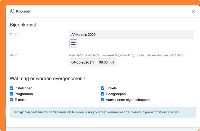 Kopieer je een bestaande bijeenkomst als basis voor een nieuwe? Dan verschijnt er nu een melding wanneer je de e-mails meekopieert. Deze herinnering attendeert je erop om de e-mailteksten te controleren en aan te passen aan de nieuwe bijeenkomst.